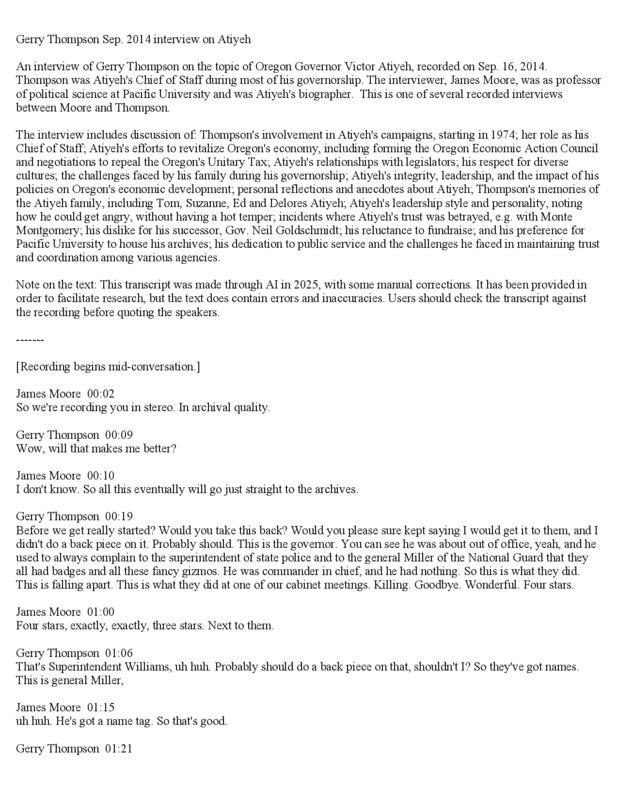 An interview of Gerry Thompson on the topic of Oregon Governor Victor Atiyeh, recorded on Sep. 16, 2014. Thompson was Atiyeh's Chief of Staff during most of his governorship. The interviewer, James Moore, was as professor of political science at Pacific University and was Atiyeh's biographer. This is one of several recorded interviews between Moore and Thompson.