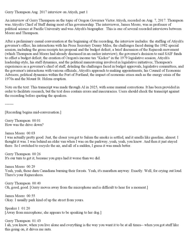 An interview of Gerry Thompson on the topic of Oregon Governor Victor Atiyeh, recorded on Aug. 7, 2017. Thompson was Atiyeh's Chief of Staff during most of his governorship. The interviewer, James Moore, was as professor of political science at Pacific University and was Atiyeh's biographer. This is one of several recorded interviews between Moore and Thompson.