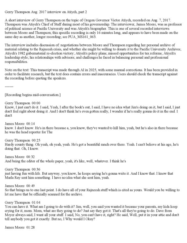 A short interview of Gerry Thompson on the topic of Oregon Governor Victor Atiyeh, recorded on Aug. 7, 2017. Thompson was Atiyeh's Chief of Staff during most of his governorship. The interviewer, James Moore, was as professor of political science at Pacific University and was Atiyeh's biographer. This is one of several recorded interviews between Moore and Thompson; this specific recording is only 16 minutes long, and appears to have been made on the same day as another, longer recording.