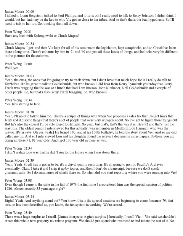 An interview of Peter Wong regarding Oregon's Governor Victor Atiyeh, recorded on August 4, 2015. Wong was a journalist who covered Oregon politics for over forty years while working for the Salem Statesman Journal and other newspapers. The interviewer, James Moore, was as professor of political science at Pacific University and was Atiyeh's biographer.