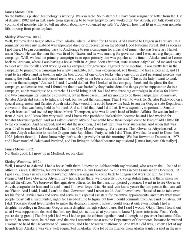 An interview of Shirley Woodrow regarding Oregon's Governor Victor Atiyeh, recorded on June 17, 2015. Woodrow was the Executive Director of the Oregon Republican Party while Atiyeh was running for governor in 1978. The interviewer, James Moore, was as professor of political science at Pacific University and was Atiyeh's biographer.