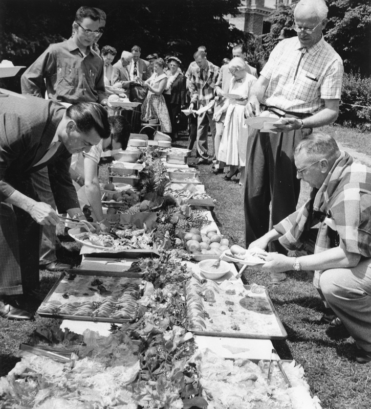 Pacific University students, alumni and faculty getting food from a buffet line during a Luau held outdoors on May 25, 1957. Several attendees wear leis. The food is laid out on trays sitting directly on the ground, with pineapples used as decorations. This lu'au was held on the Saturday afternoon preceding Pacific's 1957 Commencement ceremony, on the lawn by McCormick Hall. The photograph was taken by Herb Drew (Class of 1960). For two other images of the same event, see: PUApic_008558 and PUApic_008559.