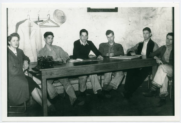 Photograph of the Heart of Oak staff at Pacific University, featured in the 1965 Heart of Oak yearbook. Pictured are Bill Forst, Marian Mirikitani, Joanne Aki, Grace Morizawa, Bruce Bishop, Barbara Williams, Kathy Smith, and Sue Geldman.