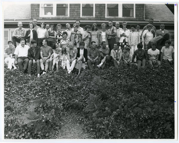 Photograph of Chris Bender, a student of Pacific University in the late 1960s. She appears to be sitting in a Pacific University classroom talking to two unidentified students.