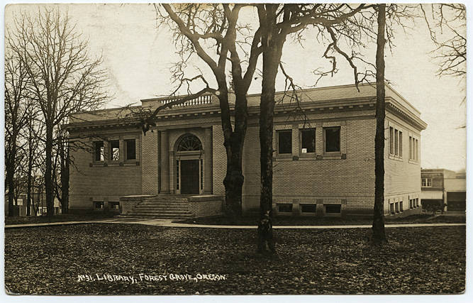 Photograph of Pacific University's Carnegie Library, taken shortly after the building was finished in 1912. Warner Hall is visible on left side of photograph.