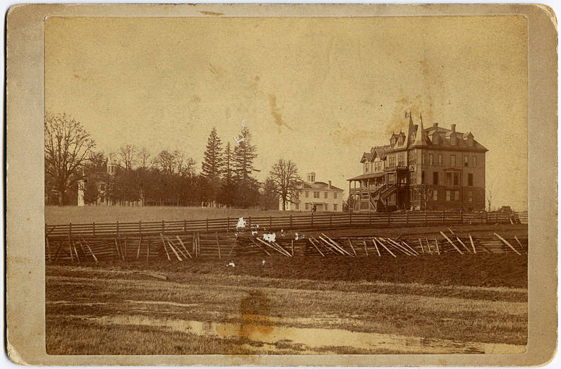 Cyrus Walker family portrait. An inscription on the back identifies them from left to right as Mrs. Cyrus Walker, (i.e. Lucy Maria Tanner Walker), Miss Tanner (the sister of Lucy Maria), and Mr. Cyrus Walker. Cyrus and Lucy Maria married in 1859, and this was likely taken within a few years afterwards, before their daughter was born in 1865. The sister is not identified by name, but is most likely Susan Lucinda Tanner, who would have been about 15 years old in 1860. The other Tanner sister, Emily, was only 11 at that time.