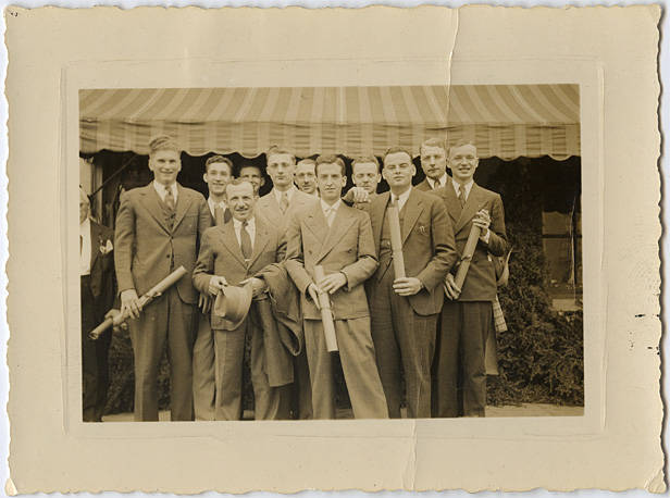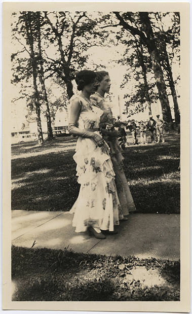 1931 May Day Court sitting on their thrones. The Queen in the center is Florence Gross a Pacific University graduate of 1931. The rest of the court is as follows (order unsure): Gertrude Bagnall, graduate of 1932, Dorothy Thompson, graduate of 1932, Viola Paterson, graduate of 1931, Mary Laack, graduate of 1931, Betsey Asher, graduate of 1931, and Ethel Bradford, graduate of 1931.