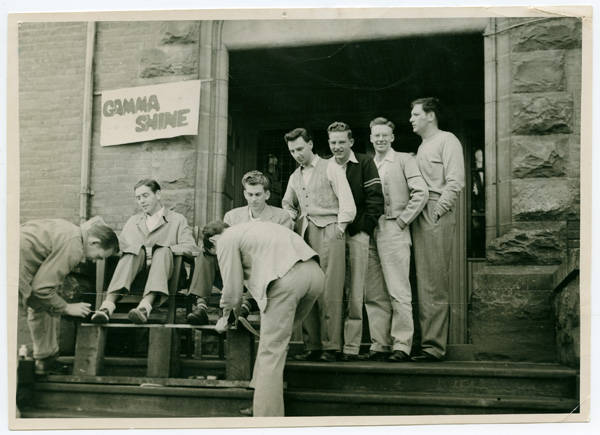 A group of eight male students participating in the Gamma Shine in front of Marsh Hall on the Pacific University campus. Sign on the wall of Marsh Hall reads, 'Gamma Shine'.