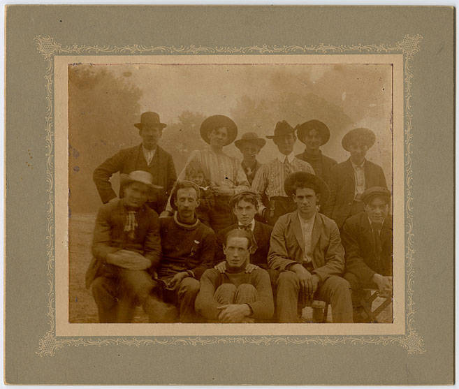 An unidentified group of young men pose for a photo. Most of the men are in moderately nice clothing and one has a small child with him. Originally this photo was found in folder marked Charles Walker Family so there may be some connection.