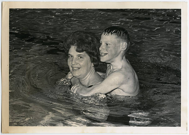 Mrs. Jean Horner and two young boys at the community swimming pool. Mrs. Horner served as Director of Women's Physical Education at Pacific University in the 1950s.