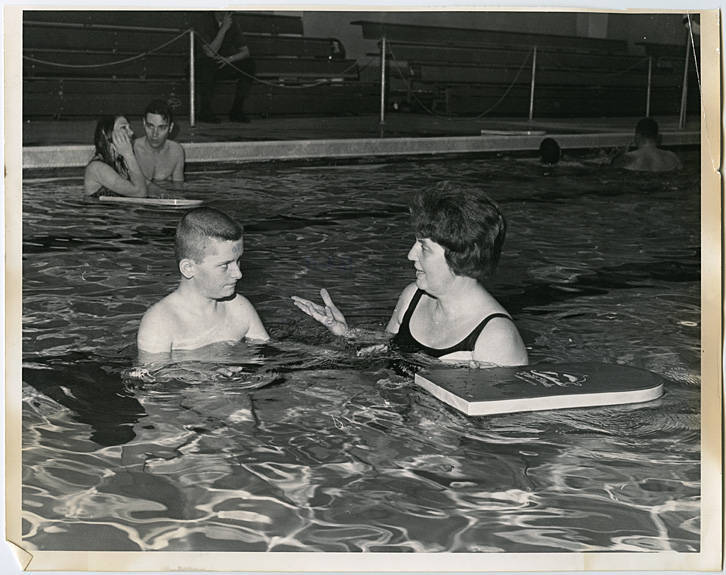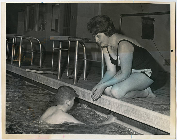 Mrs. Jean Horner teaches a young boy to swim by the pool's edge. Mrs. Horner served as Director of Women's Physical Education at Pacific University in the 1950s.