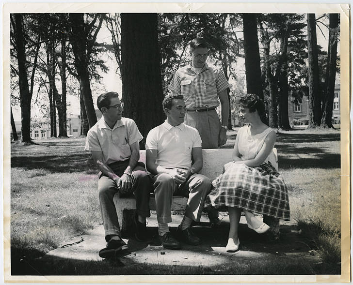 A group photo of the Pacific University class of 1891. Students in back row from left to right: John A. Lee, Asa B. Snider, John Hodgin, William A. Bates. Students in front row from left to right: Mary E. Patton (Snyder) and Margaret (Dolly) Hinman.