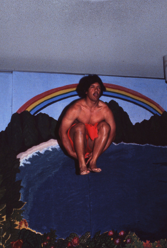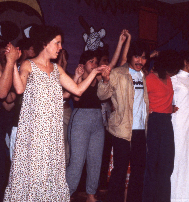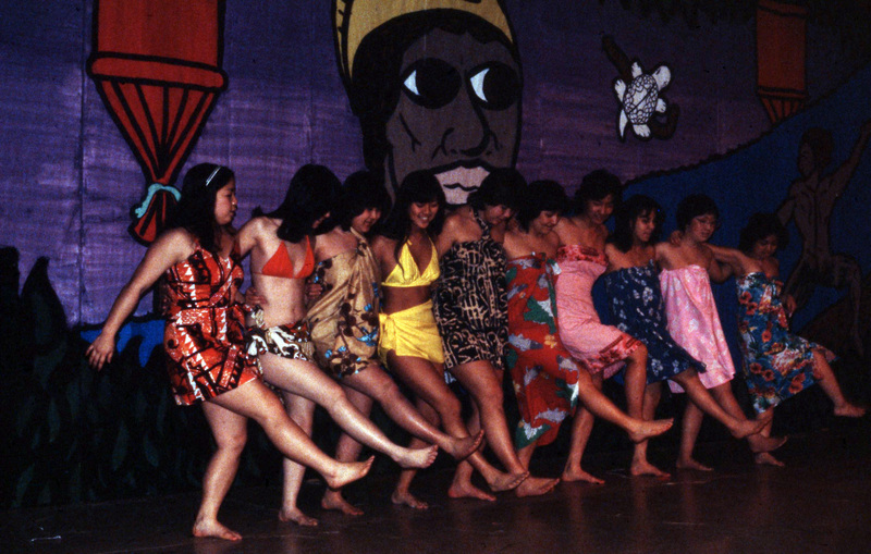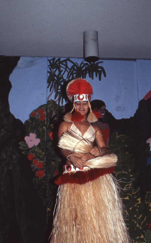 Students performing a Maori-inspired dance at Pacific University's annual Lu'au in 1978. The woman wears a black sheath dress with a piupiu-style belt, and has poi balls hanging at at her waist.