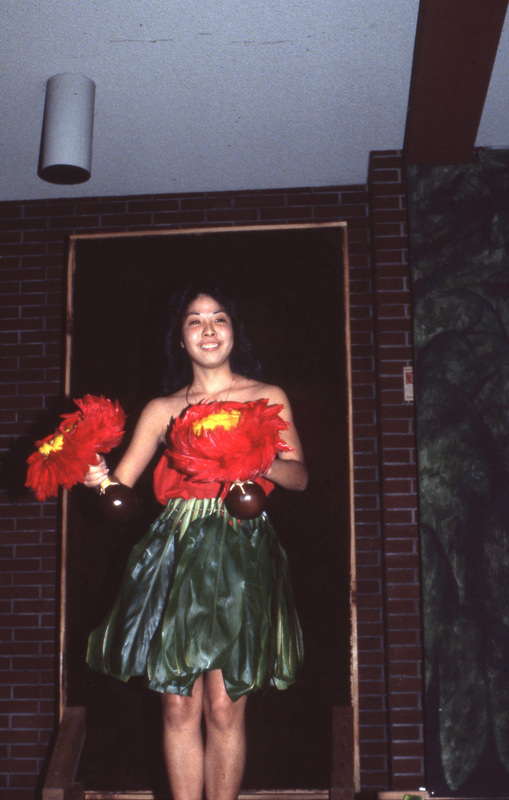 A woman performs a Tahitian-style dance on stage at Pacific University's annual Lu'au in 1982. She is wearing a tasseled grass skirt and headress, and is holding grass hand tassels.