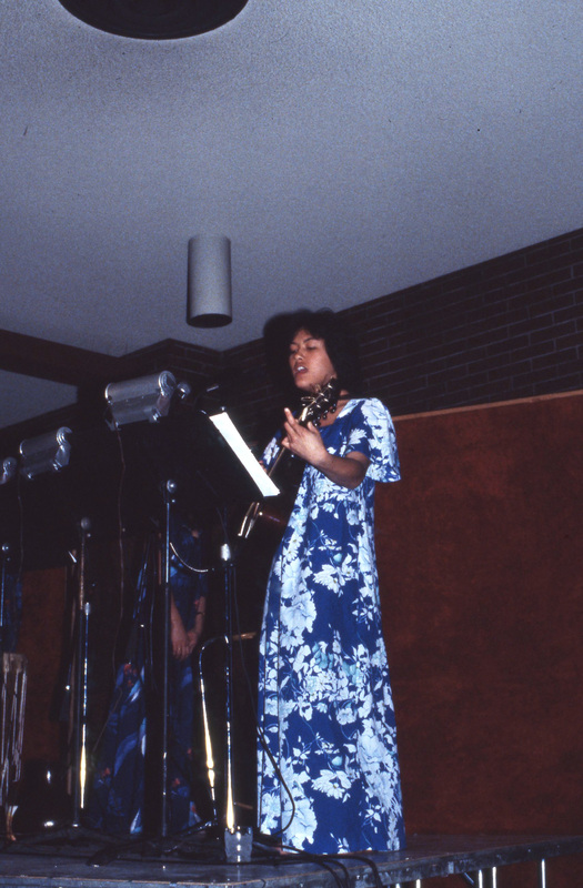 Four women and one man sing and play music on stage at Pacific University's annual Lu'au in 1981. They are wearing matching blue and white printed clothing.