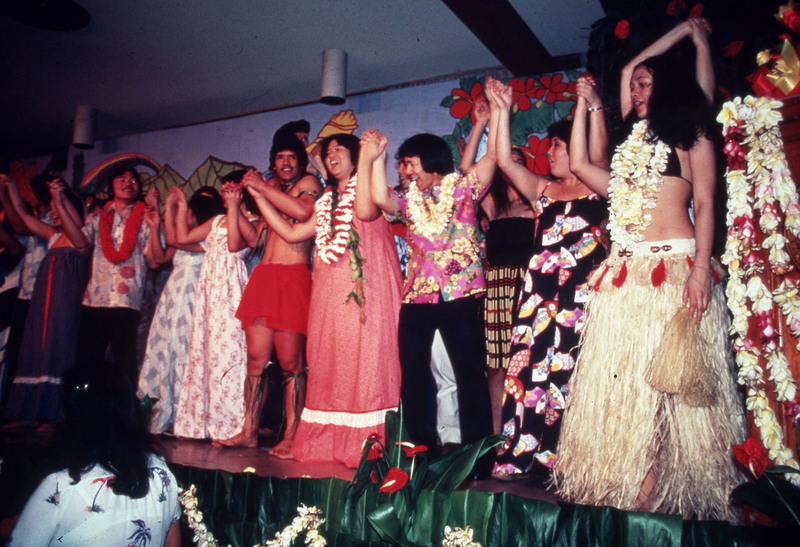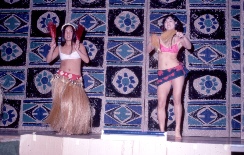 Two Pacific University students, identified on the original slide as Cathy Chung (Class of 1973) and Leila Tong. They are performing at the university's annual Lu'au probably between 1971-1973. Chung is wearing a grass skirt. This photograph appears to have been taken during a rehearsal: the cardboard at the base of the stage would be covered with flowers and greenery during the actual performance.