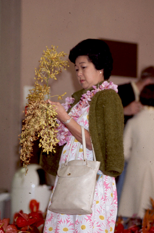 A woman wearing Hawaiian clothing and holding red anthurium flowers at Pacific University's annual Lu'au circa 1969-1970. She was likely the mother or aunt of Millie Ah Ching, a Pacific student who was very active in Haumana O Hawai'i (Hawaiian Club), which hosted the event. The parents of Hawaiian students would ship fresh flowers via from Hawai'i each year for this event, which were used as decorations or sold as concessions.