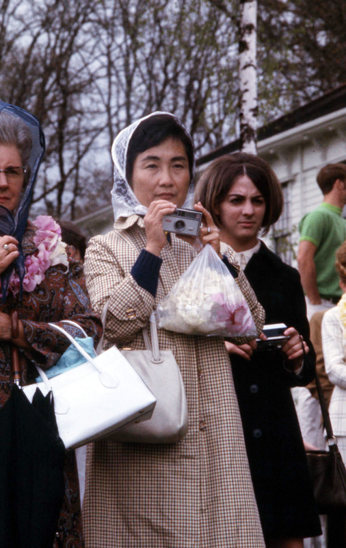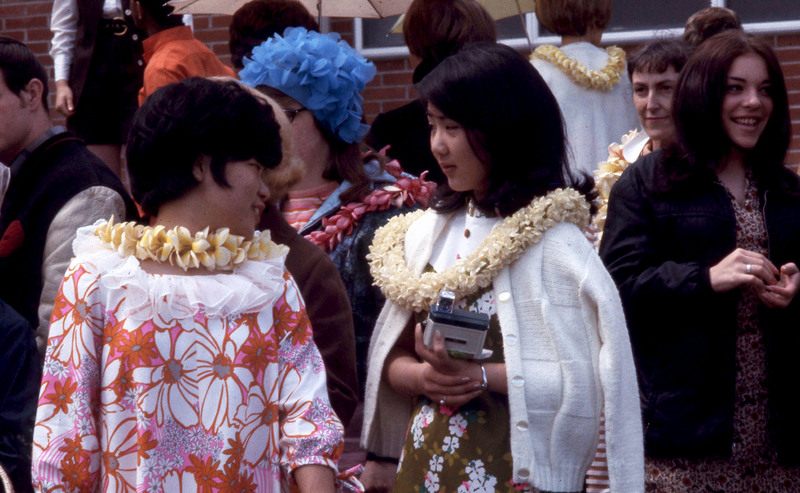 Pacific University women students dressed in green satin dresses and beaded headbands, on their way to perform at the annual Lu'au in 1969 or 1970. The woman in the background holding a camera is identified on another slide as "Miyazono," and is probably a relative of Pacific University student Gail Miyazono, of the Class of 1972.