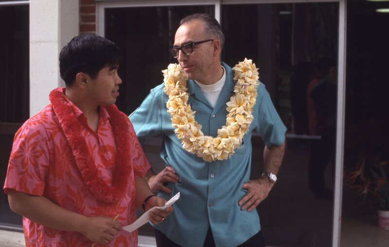 A Pacific University student (possibly named Doug, per a note written on the slide) and Professor Fred Scheller, both wearing leis. The two men are talking on the patio of the Washburne Center during Pacific University's annual Lu'au circa 1969-1970. Scheller was one of the founding organizers of the annual Lu'au.