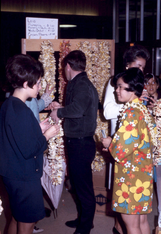A vendor selling leis stands by a concession stand at Pacific University's annual Lu'au, probably in 1969 or 1970. Customers are examining the leis. A sign notes the prices: Plumeria leis, $1; Plumeria w/ vanda, $2; Vanda orchid, $2.50; Crown flowers, $1. Revenues from concessions at the Lu'au went towards scholarships for Haumana O Hawai'i (Hawaiian Club) students. Students' family members shipped flowers, leaves and other fresh materials by air to supply the event.