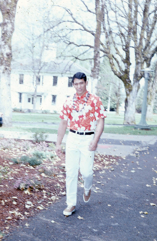 A student wearing an aloha shirt and a lei, walking on Pacific University's campus with Old College Hall in the background. Based on other images found with this slide, he was walking to the university's annual Lu'au, probably in 1969 or 1970.