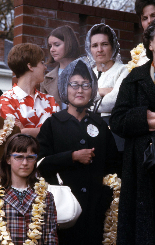 Sue Yokouchi with several other parents and relatives of students getting ready to attend Pacific University's annual Lu'au, circa 1969-1970. Sue Yokouchi was likely the mother of Karen Yokouchi, Pacific University Class of 1972.