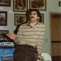 Washington County Community Action Executive Director Gordon Molitor standing next to a slide projector. Molitor was executive director for 7 years before resigning in order to taking a job in Sierra Leone with CARE, an international aid organization. This is from the records of the Washington County Community Action Organization, an anti poverty nonprofit.