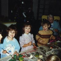 Children with the Head Start program taking part in some arts and crafts with Ethel, a 93 year old foster grandmother. Head Start in Washington County, Oregon, is a Community Action Program that provides educational support and services to children from low income households. This is from the records of the Washington County Community Action Organization, an anti poverty nonprofit.