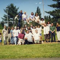 Washington County Community Action Community Resource Department staff photo. In the upper left wearing the blue shirt is Department Director Lowell Greathouse. In the middle front holding the football is staff manager Jose Gonzalez. In the back row on the right wearing a blue sleeveless shirt is staff manager Judy Schilling. In the middle wearing the green shirt is staff manager Carol Lopez. On the middle left with the white hair and white shirt is staff manager Carol Surrency. On top with the blonde hair, white T-shirt, and white shorts is staff manager Becky Smith. Directly to the right of Smith is staff manager Connie Sherrard. Directly to the left of Smith is staff manager Joan Ellen Jones. In between Jones and Schilling is staff manager Rebecca last name unknown. This is from the records of the Washington County Community Action Organization, an anti poverty nonprofit.