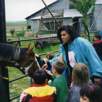 Head Start children petting a horse while on a field trip to Pearly Pig farm in Washington County, Oregon. With the children in Maria Wilson, who was most likely a teacher for Head Start. In Washington County, Head Start is a Community Action program that provides educational support and services to children from low income households. This is from the records of the Washington County Community Action Organization, an anti poverty nonprofit.
