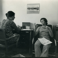 Carla Johnson (left), Executive Director of Community Action in Washington County, Oregon, speaking to Volunteers in Service to America (VISTA) volunteer Eric Cain. VISTA is an anti poverty community service program started as part of the Economic Opportunity Act of 1964. This is from the records of the Washington County Community Action Organization, an anti poverty nonprofit.