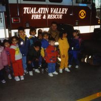 Tigard-Tualatin Head Start students posing with a firefighter in front of a Tualatin Valley Fire and Rescue firetruck. The Tigard-Tualatin Head Start program is a part of the Community Action Organization and provides educational services and support to children from low income families in the Tigard-Tualatin school district in Washington County, Oregon. This is from the records of the Washington County Community Action Organization, an anti poverty nonprofit.