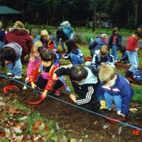Tigard-Tualatin Head Start students outside doing some gardening. The Tigard-Tualatin Head Start program is a part of the Community Action Organization and provides educational services and support to children from low income families in the Tigard-Tualatin school district in Washington County, Oregon. This is from the records of the Washington County Community Action Organization, an anti poverty nonprofit.
