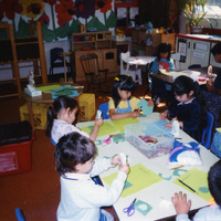 Tigard-Tualatin Head Start students doing arts and crafts in their classroom. The Tigard-Tualatin Head Start program is a part of the Community Action Organization and provides educational services and support to children from low income families in the Tigard-Tualatin school district in Washington County, Oregon. This is from the records of the Washington County Community Action Organization, an anti poverty nonprofit.