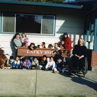 Tigard-Tualatin Head Start students posing in front of the Lafky House in Tualatin, Oregon. The landmark is named after a prominent family in Tualatin's history. The Tigard-Tualatin Head Start program is a part of the Community Action Organization and provides educational services and support to children from low income families in the Tigard-Tualatin school district in Washington County, Oregon. This is from the records of the Washington County Community Action Organization, an anti poverty nonprofit.