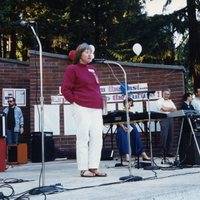 - Washington County Community Action's first executive director Carla Johnson speaking at Washington County Community Action's 25th annual reunion picnic. This is from the records of the Washington County Community Action Organization, an anti poverty nonprofit.