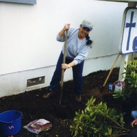 Washington County Community Action Energy and Emergency Services Coordinator Chavela Mendoza planting rhododendrons in front of the Cornelius United Methodist Church with Even Start participants. Even Start is a federally funded program that provides family literacy training. This is from the records of the Washington County Community Action Organization, an anti poverty nonprofit.