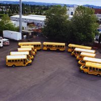 - 11 Washington County Head Start school busses gathered in formation in a large parking lot. Head Start is a program that provides early educational support and services to children from low income households. This is from the records of the Washington County Community Action Organization, an anti poverty nonprofit.