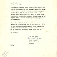 Letter to Birgetta Nixon, a resident of Cherry Grove, from Donald C. Jones, the Chairman of the Board of Directors of Community Action for Washington County, Oregon. He asks her to bring additional guests to the elections for the Board in 1967. This is from a binder compiled by Nixon.