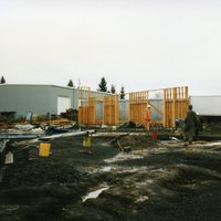 Construction site of the Hillsboro Multi-Service Center, Washington County Community Action's headquarters in Hillsboro, Oregon. Concrete and rebar is in place and one wall of wooden framing has been erected. This is from the records of the Washington County Community Action Organization, an anti poverty nonprofit.