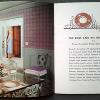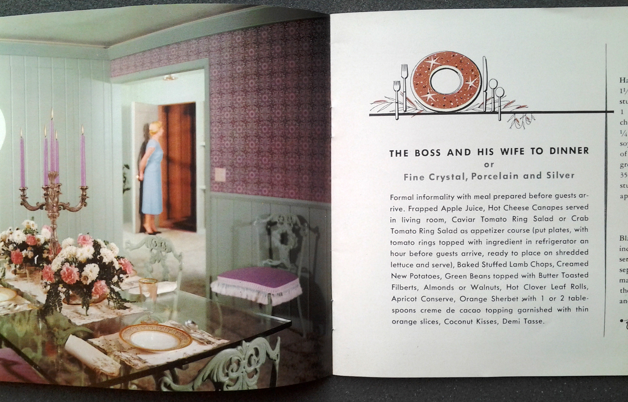 An article and illustration on how to entertain company from a recipe and household hints booklet, 'Famous Recipes from West Coast Kitchens.' The article is accompanied by suggested recipes for stuffed lamb chops and a tomato ring salad. The booklet was issued by the West Coast Lumberman's Association in Portland, Oregon, to advertise wood paneling and cabinetry products.