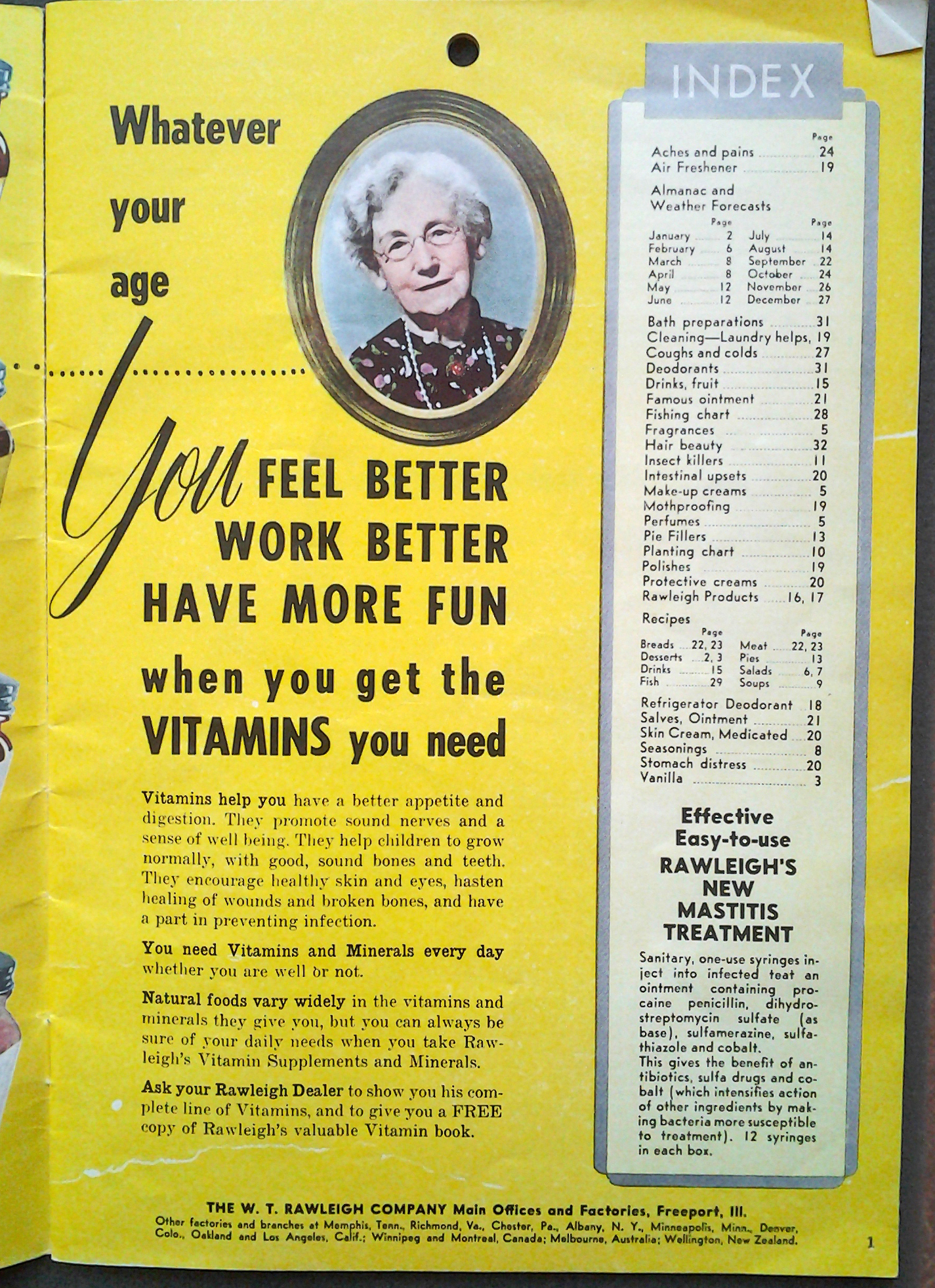 This index page from the 1957 issue of 'Rawleigh's Good Health Guide' features an advertisement for Rawleigh's vitamins. It notes, 'Natural foods vary widely in the vitamins and minerals they give you, but you can always be sure of your daily needs when you take Rawleigh's Vitamin Supplements and Minerals.' A syringe treatment for mastitis is also advertised.