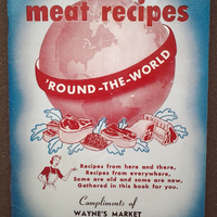 A meat cookbook published by the National Live Stock and Meat Board Home Economics Department to promote buying meat. This copy was distributors to shoppers at Wayne's Market in Eugene, Oregon. It includes Americanized recipes from many world cuisines including Japan, Iraq, Chile, England and Mexico.