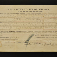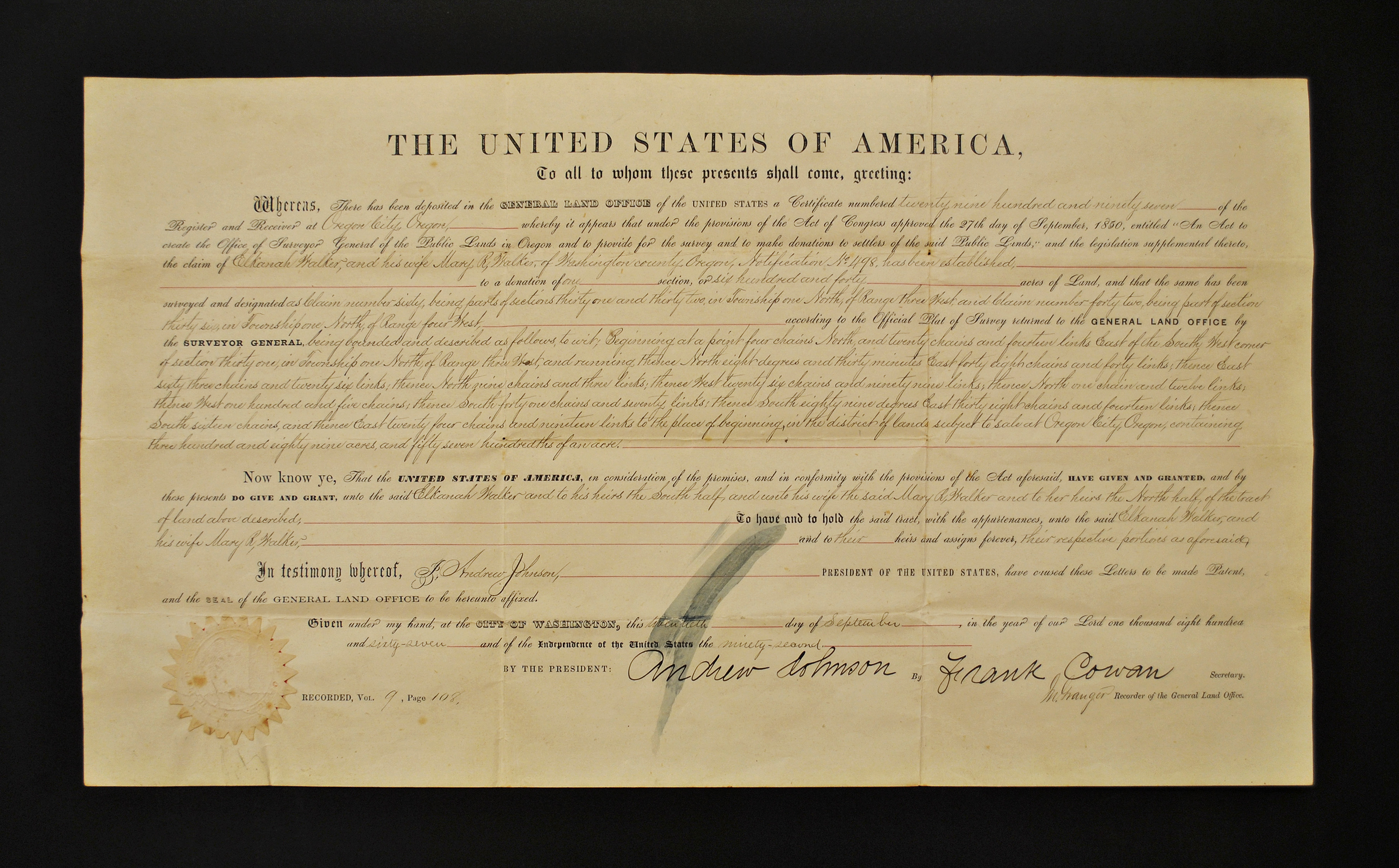 The certificate for Elkanah and Mary Richardson Walker's donation land claim in Forest Grove, Oregon. The Walkers were among the earliest immigrants from the United States to the Oregon Territory. After living as missionaries on Spokane lands, they arrived in the area that would later become Forest Grove in 1848. There, the family helped to found Pacific University. They gave some of the land that is described in this claim to Pacific University, forming a large part of its original campus.