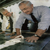 - Governor Victor Atiyeh adding his hand prints to a sidewalk at an unidentified event. This is one of a set of photographs taken by Gerry Lewin, a photographer for the Salem Statesman Journal.