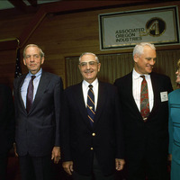 Governor Victor Atiyeh standing with several other former Oregon governors at an Associated Oregon Industries event. From left to right: Mark Hatfield (governor 1959-1967); Robert W. Straub (1975-1979); Victor Atiyeh (1979-1987); Neil Goldschmidt (1987-1991); and Barbara Roberts (1991-1995). This is one of a set of photographs taken by Gerry Lewin, a photographer for the Salem Statesman Journal.
