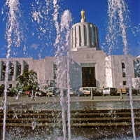 - Photograph of the Oregon capitol building taken from across the street with a fountain in the foreground. This is one of a set of photographs taken by Gerry Lewin, a photographer for the Salem Statesman Journal.