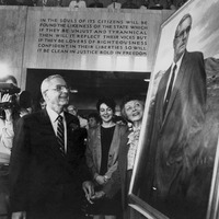 - Governor Victor Atiyeh stands with his wife, Dolores, at the unveiling of his portrait in the Oregon capitol building on February 13, 1987. This is one of a set of photographs taken by Gerry Lewin, a photographer for the Salem Statesman Journal.