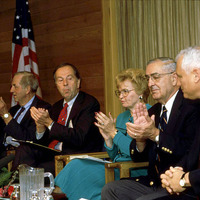 Governor Victor Atiyeh sitting with several other former Oregon governors at an Associated Oregon Industries event. From left to right: Mark Hatfield (governor 1959-1967); Robert W. Straub (1975-1979); Jack (unidentified); Barbara Roberts (1991-1995); Victor Atiyeh (1979-1987); and Neil Goldschmidt (1987-1991). This is one of a set of photographs taken by Gerry Lewin, a photographer for the Salem Statesman Journal.