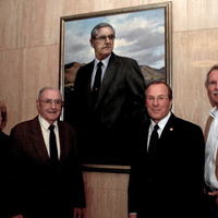 Governor Victor Atiyeh standing beside his portrait with three other former Oregon governors at the Kulongoski photo dedication in the Oregon capitol building. From left to right: Barbara Roberts (governor 1991-1995); Victor Atiyeh (1979-1987); Theodore Kulongoski (2003-2011); and John Kitzhaber (1995-2003 and present). This is one of a set of photographs taken by Gerry Lewin, a photographer for the Salem Statesman Journal.